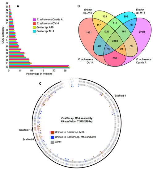 A global, functional analysis of the Ensifer sp. M14 proteome was performed using COG categories, and the proteome was compared with closely related species to identify general functional biases. This analysis was performed with the goal of identifying recently acquired genomic islands that may contribute to the adaptation of Ensifer sp. M14 to the gold mine environment. When compared with Ensifer sp. A49, E. adhaerens OV14, and E. adhaerens Casida A, no statistically significant biases (pairwise Fisher’s exact tests, p > 0.05 in all cases) in COG category abundances were detected in the Ensifer sp. M14 proteome (Figure 3A). However, there was a slight, but statistically insignificant (pairwise Fisher’s exact tests, p > 0.05), enrichment in inorganic ion transport and metabolism (COG P) in the proteomes of Ensifer sp. M14 and Ensifer sp. A49 compared to the other two strains (Figure 3A). These results suggest no gross functional changes in the Ensifer sp. M14 genome occurred during adaptation to growth in the Zloty Stok gold mine, at least at the general level of COG categories.