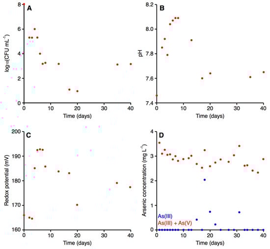 Using the start-up procedures described in the Materials and Methods, the initial quantity of bacteria in the bioreactor after yeast extract augmentation was about 108 CFU mL−1 (Figure 4). The value was almost nine orders of magnitude higher compared to raw arsenic-contaminated water, where the CFU mL−1 (when plated on Luria-Bertani agar medium) was about 100.