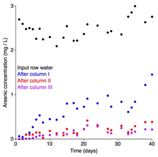 Previous studies have observed that there is a relationship between pH and redox potential with the arsenite/arsenate ratio; arsenites are the predominant form in reducing conditions and lower pH values, as the concentration of the arsenate form increases, both pH and redox potential also increase [83,84]. We therefore evaluated the pH and the redox potential in the treated water. For both parameters, the biological treatment had a small but noticeable effect. In the raw water, the pH and the redox potential were 7.48 and 170.90 mV, respectively [56]. In the case of the pH, the value in the bioreactor systematically increased up to the eighth day, with the treated water reaching a pH of 8.09 (Figure 4B). The pH returned to 7.60 by day 17, following which the pH stabilized in the range of 7.60 to 7.65 until the end of the experiment (day 40). In general, the redox potential remained relatively stable (Figure 4C). For the first three days, a value around 155.00 mV was observed, following which the redox potential increased and stabilized (with a slight, gradual decrease) within a range from 177.00 mV and 193.00 mV, with the exception of day 20. Water for human consumption is expected to have a pH in the range of 6.50–9.00 [85] and a redox potential between 100 and 300.00 mV [86]. Thus, both the pH and the redox potential of the water treated with our installation fell within the acceptable range for drinking water.