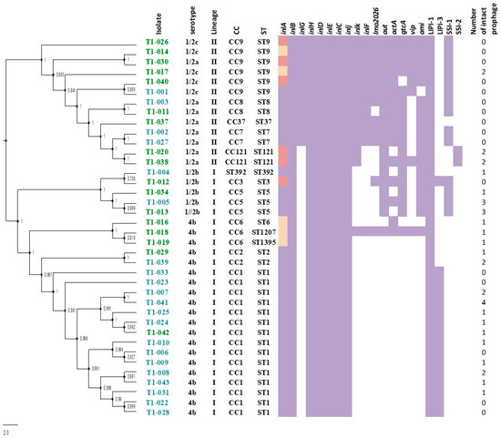 In this study, the distribution of selected virulence genes and genetic elements related with stress survival were surveyed. Genes encoded in LIPI-1 (prfA, plcA, plcB, hly, and mpl) and the inlAB operon, which encodes internalin A and B, were present in all 38 isolates (Figure 1). A previous study conducted in Chile of L. monocytogenes isolated from foods (e.g., raw meat, cheese, and frozen seafood) reported a different distribution of these genomic elements. In the previous study, the LIPI-1 cluster and the inlAB operon were found to be associated with a given serotype and food group [24]. However, methodologies and isolates between our study and this previous are different, which may explain the difference in the results. Reports in France and China found these genes in all isolates and both studies used WGS [16,50]. Other internalin family members (inlC, inlJ, inlH, inlD, inlE, and inlJ) were detected in all isolates (Figure 1). However, inlG, inlF, and inlK were found not evenly distributed among isolates. The genes inlG and inlK were found in 14 isolates and inlF in 12 isolates. Most of these isolates were obtained from non-clinical sources, which are commonly represented by Lineage II. The presence of inlG seems to be associated with Lineage II and our result agree with previous studies using PCR that associated the presence of these internalins exclusively with Lineage II [51,52]. Additionally, an analysis looking at 81 distinct genes in the database of VirulenceFinder for Listeria identified seven genes distinct to internalins (i.e., lmo2026, aut, actA, gtcA, vip, and ami) that showed diversity in their content (Figure 1). Other virulence markers possibly associated with lineage is LIPI-3, which was exclusively found in 15 isolates of the Lineage I of serotype 4b and one from serotype 1/2b (Figure 1). LIPI-3 has been previously associated with Lineage I, serotype 4b [53,54], and with Lineage III and Listeria innocua [55,56]. Conversely, the stress survival associated gene cluster known as SSI-1 was found in both lineages. SSI-1 was found in 37% of isolates and most of these isolates belonged to CC9, CC8, and CC7 of Lineage II and to CC5 and CC3 (both Lineage I). However, SSI-2 was found only in two isolates from CC121 (Lineage II). This is consistent with previous reports that indicate SSI-2 to be only associated with CC121 isolates [18]. The analysis of the plasmids identified that none of the isolates contained a known plasmid. In addition, the only antimicrobial resistance gene identified was the gene fosX, which confers resistance to fosfomycin identified in all 38 isolates. The number of prophages detected with PHAST was very diverse and ranged from 0 to 4 intact prophages detected (Figure 1).