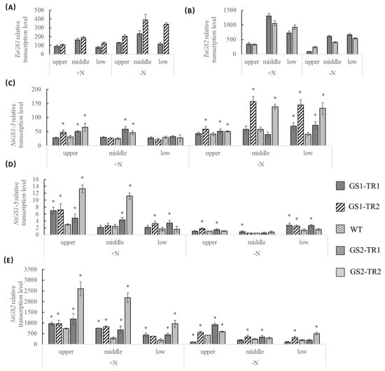 Relative transcription levels of Triticum aestivum glutamine synthetase (GS) TaGS1 (A), TaGS2 (B), Nicotiana tabacum glutamine synthetase (GS) NtGS1-3 (C), NtGS1-5 (D) and NtGS2 (E) in the upper, middle, and lower leaves of transgenic plants grown under nitrogen-sufficient (N+) and nitrogen-starvation (N−) conditions. Data are means of three independent biological replicates ± standard deviation (SD). Asterisks indicate that the data is significantly different (p < 0.05) from the data of wild type (WT) plants.
