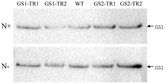 In the roots, GS1 was the main subunit and no GS2 polypeptide was detected in WT and TaGS transformants. Compared with the WT, TaGS transformants had higher levels of GS1 subunits (Figure 4). Under nitrogen starvation, the contents of GS1 subunit were higher than those under nitrogen-sufficient conditions (Figure 4).
