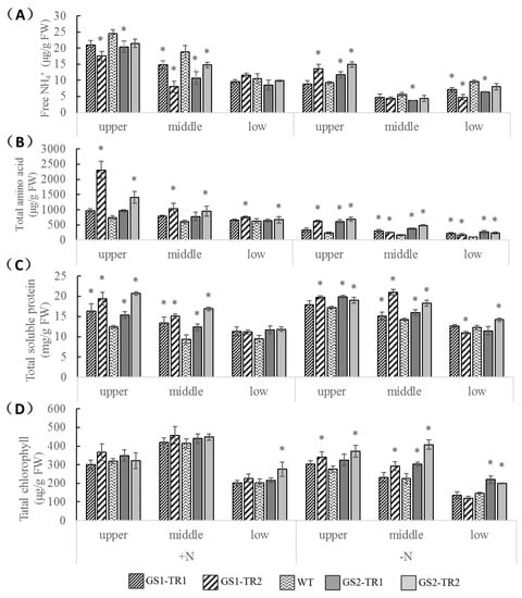 Nitrogen metabolite levels in the upper, middle, and lower leaves of GS1-TR, GS2-TR, and the WT plants grown under nitrogen-sufficient and nitrogen-starvation conditions. The free NH4+ (A), total free amino acid (B), total soluble protein (C) and total chlorophyll (D) content were determined. Each value is shown as the mean ± standard error of three replicates. Asterisks indicate that the date is significantly different (p < 0.05) from the data of WT plants.