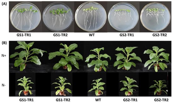 The roots are central to the acquisition of nitrogen and play a central role for NUE. Compared with the WT, GS1-TR had longer root length and significantly higher root dry weight, but GS2-TR showed a similar root length to the WT, and only GS2-TR2 had significantly higher root weight (Figure 8 and Table 1). Under nitrogen starvation, the dry weight of GS1-TR was higher than that under nitrogen-sufficient conditions; in addition, the root length of GS1-TR increased under nitrogen starvation (Figure 8 and Table 1).
