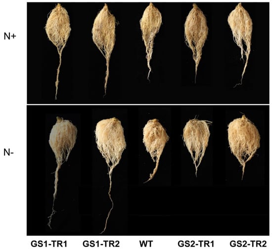 The root phenotype of transgenic tobacco GS1-TR and GS2-TR, compared with that of the WT, after 7 weeks of growth under nitrogen-sufficient (N+) and nitrogen-starvation (N−) conditions.