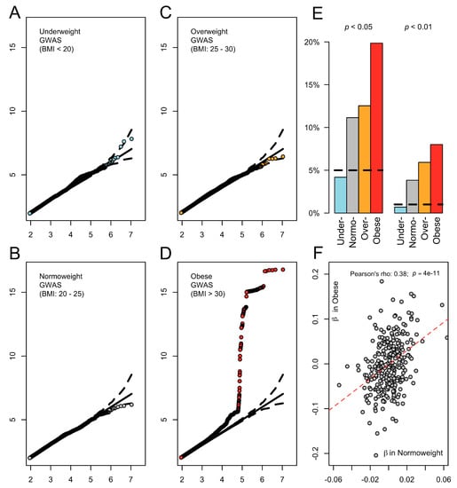 The genetic control of body mass index (BMI) differs across body fat categories. (A–D) Q-Q plots depicting genome-wide association results for stratified-genome-wide association studies (GWAS) for each BMI category. Y-axis displays the -log10 of the p-value of association derived from linear regression (see Methods Section 2.2 Stratified GWAS). (E) Barplots showing the percentage of the 283 BMI-associated single nucleotide polymorphisms (SNPs) (see Methods Section 2.3 Calculation of Genetic Risk Scores) that pass nominal significance (p < 0.05 and p < 0.01 are depicted). With the exception of the underweight sub-group, all the other three BMI subgroups harbor an excess of positive replications of the GIANT signals, implying an excess of real effects. The horizontal dashed line corresponds to random expectation. (F) Scatterplot of the β in normoweight and obese subgroups for the same SNPs.