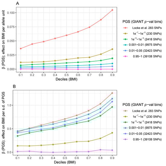 A series of OLS models were fit for each PGS based on different GWAS p-value bins, namely 10−7 < p < 10−5 (230 SNPs), 10−5 < p < 10−3 (2418 SNPs), 10−3 < p <0.01 (9975 SNPs), 0.01< p < 0.05 (32,423 SNPs), and lastly, p > 0.95 (39,108 SNPs). Figure 2A plots the β estimates of the substitution effect of each unweighted PGS on BMI in deciles of the BMI distribution. Confirming the results of Abadi et al. using cohorts unrelated to the UK Biobank, the effects of the PGS based on 283 GIANT SNPs increase significantly across the BMI distribution with effects per allele that are over two-fold stronger in the highest vs. lowest BMI decile.