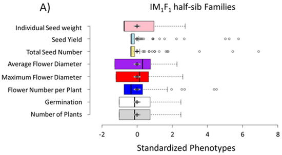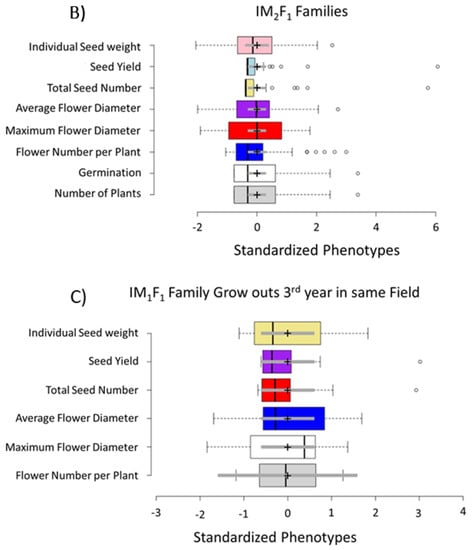 Phenotypic ranges are shown as standardized phenotypes in (A) IM1F1 half-sib families in the first two years; (B) IM2F1 families in the first year; and (C) IM1F1 families, evaluated as the third year after being in the same plots for three consecutive years. In the boxplots the center lines show the medians and box limits indicate the 25th and 75th percentiles. The whiskers extend 1.5 times the interquartile range from the 25th and 75th percentiles. The outliers are represented by dots and the crosses represent sample means