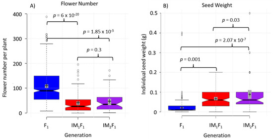 Gain from selection in domestication traits in the interspecific hybrid generation and subsequent generations derived from intermating within the population. (A) Decrease in flower number; (B) Increase in individual seed weight; (C) Multi-branched small headed F1 populations, (D) Minimally branched IM1F1, (E) IM1F1 with increased head size, (F) IM1F1 with increased head size. P-values represent t-tests between different generations.