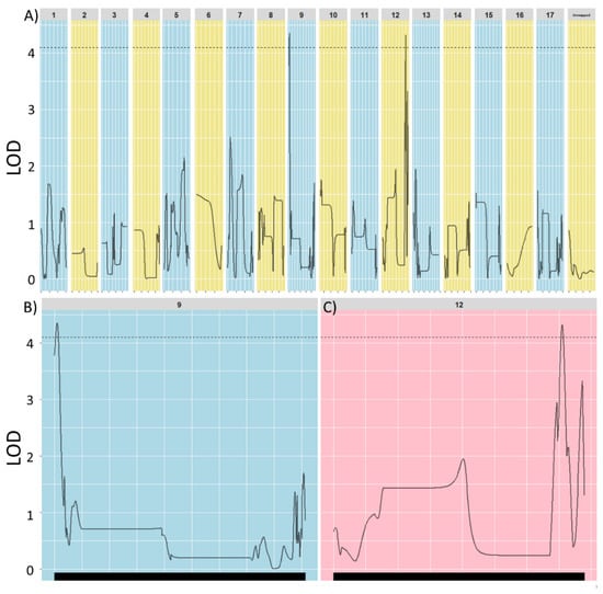 Quantitative trait locus (QTL) for tuber formation identified after markers placed on the HA412-HO genome, (A) Haley-Knott regression identified two significant QTL, implying oligogenic control across the seventeen chromosomes of Helianthus annuus; (B) Chromosome 9 close up and corresponding QTL; (C) Chromosome 12 close up and corresponding QTL. In all panels, the dotted line indicates a significance level of p < 0.01 as determined by a permutation test. LOD (logarithm of the odds).