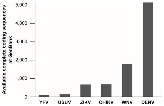 The target regions of published molecular assays for YFV detection are not evenly spread across the viral genome. Of at least 20 published assays for molecular YFV diagnostics, six target the 5′UTR, five the NS5 coding region and four the NS1 coding region. Remarkably, the information about the genetic variation of YFV is relatively small and is limiting reliable oligonucleotide design for YFV detection. As of 15 May, only 88 complete coding sequences of YFV isolates are available at GenBank, NCBI. This number is surprisingly low given the long time-span since the discovery of YFV and given its medical relevance. In comparison, the genetic information available for other arboviruses is considerably greater, including for the bird-associated Usutu virus (USUV), that causes only sporadic human infections [279] (Figure 2). This underrepresentation of YFV in terms of genetic data might be a major problem for public health since existing real-time RT-PCR assays are designed based on limited knowledge about genetic YFV diversity and nucleotide mismatches at oligonucleotide binding sites may affect test performance [223,280]. Despite the relatively low evolutionary rate of YFV [28,108,133], larger YFV genomic datasets are urgently required to ensure reliability of molecular YFV diagnostics.