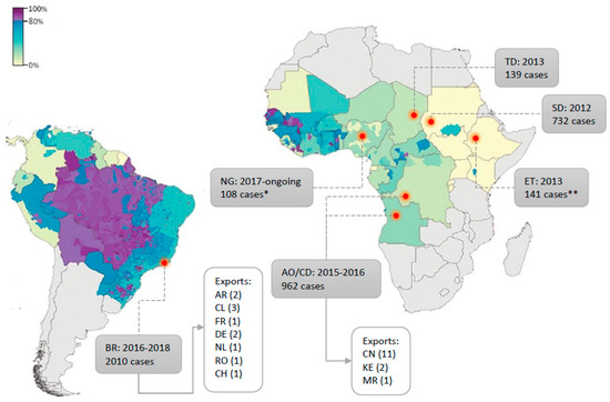 Yellow fever (YF) outbreaks since 2010 with regard to vaccination coverage at the time (modified from [299]). Estimated proportion of the population (across all ages, in %) to have ever received a YF vaccine at the beginning of 2010 for countries at risk of YFV transmission, based on the untargeted, unbiased vaccination-targeting scenario [299]. Countries where YFV outbreaks occurred since 2010 are indicated by a red dot. Outbreak time-span and total number of cases are detailed in grey boxes. Export cases are detailed when applicable. All country names’ abbreviations are defined according to international ISO country codes. * Presumptive positive cases ** reported cases.