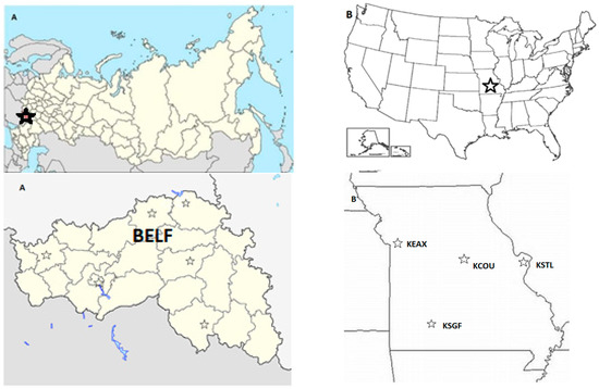 The location of the two study regions; (A) Russia (superior–Belgorod Oblast marked with a star) and Belgorod Oblast (inferior–station used is BELF), and (B) the United States (superior–Missouri marked with a star) and State of Missouri (inferior–station used is KCOU).
