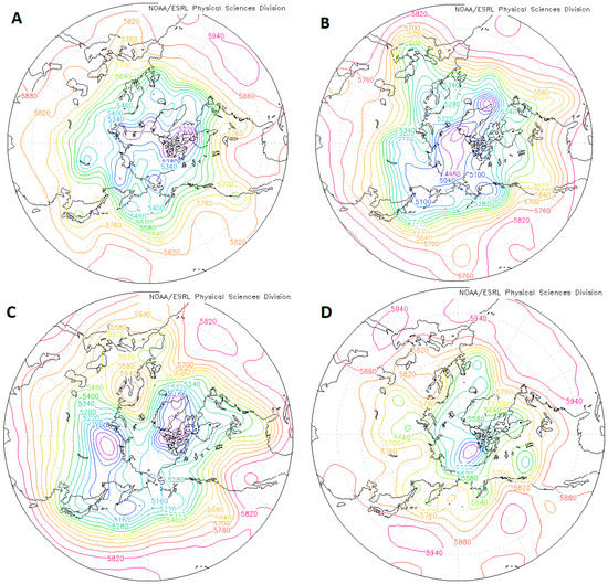 Examples of the large-scale circulation types using the 1200 UTC 500 hPa height field. The contour interval is 60 m and in color. The given examples are (A) Type 1 (6 October 2006 AO = 0.124), (B) Type 2 (8 March 2006 AO = 1.76), (C) Type 3 (6 January 2006 AO = −1.64), and (D) Type 4 (13 July 2013 AO = 0.28).