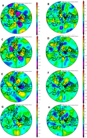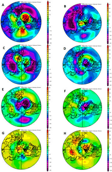 The winter (left) and summer (right) 500 hPa height anomalies (with respect to 1957–2017) for the sub-periods defined in Table 2, where (A) and (B) is 1957–1969, (C) and (D) 1970–1980, (E) and (F) 1981–1997, and (G) and (H) 1998–2017. The contour interval is 3 m.