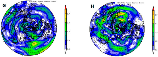 The winter season 5000 hPa anomalies (Figure 3A) resemble `state ` 1 (positive height) anomaly over Greenland – negative anomalies over the mid-latitude Atlantic) for the NAO and ‘state 2’ (positive height anomaly over the polar region, negative height anomalies in the mid-latitudes) for the AO from reference [62]. The summer season is similar, but weaker. The PNA index was negative in the winter and positive in the summer (Table 5) with the 500 hPa height anomalies reversing sign in the Gulf of Alaska region. The winter (summer) season 500 hPa anomalies also resemble the ‘state 1’ (‘state 2’) PNA in reference [62], or a positive (negative) height anomaly over the Bering Sea Region. Examining the 300 hPa meridional wind anomalies (Figure 4A,B) and vector wind anomalies (Figure 5A,B) also suggest strong meriodional flow, which was the strongest for the entire epoch (1957–2017).
