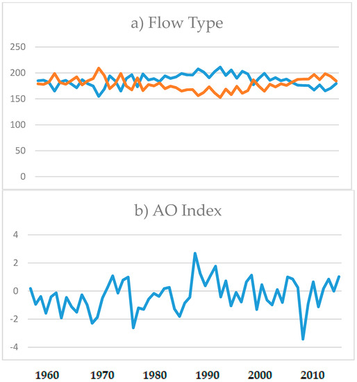 The number of (a) NH days with a zonal (Type 1 and 2—blue) and meridional (Type 3 and 4—orange) flow regimes, and (b) the winter season NAO Index from 1957–2017 following reference [62].