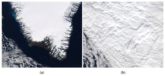 The masking effects of clouds: large differences in albedo between Greenland and open water on 4 October 2018 (a) are obscured by the presence of clouds the following day (b). When aggregated over several such scenes, this effect reduces the impact of trends and interannual variations in sea ice and snow cover on the Arctic climate. Images from NASA Worldview.