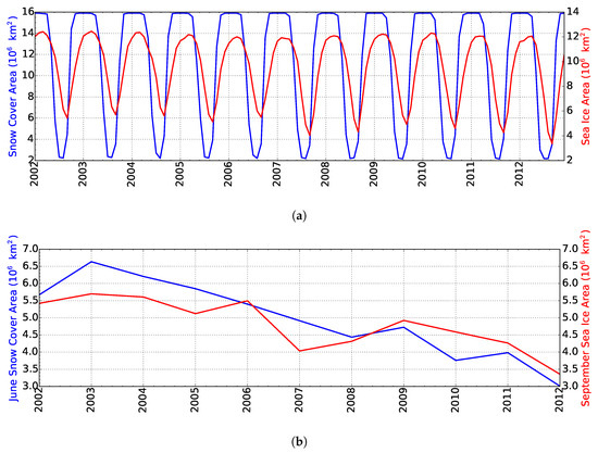 (a) Monthly average snow cover area (blue) and sea ice area (red) for 2002–2012 calculated from NSIDC SIC and SCF for the Arctic defined in Figure 3a; (b) June snow cover area (blue) and September sea ice area (red).