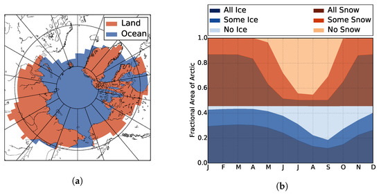 The goal of this work is to quantify the extent to which cloud cover modulates how the TOA albedo responds to changing sea ice and snow cover. This requires definitions of the Arctic and the areas covered by ice and snow. In this study, the Arctic is defined based on the mean 2-m air temperature from the Atmospheric Infrared Sounder (AIRS) on the Aqua satellite for 2002–2015. 2.5° × 2.5° grid cells in the NH with an annual mean temperature at or below 0 °C are considered part of the Arctic, as shown in Figure 3a. Defining the Arctic with this method removes most of the warm waters from the Atlantic Ocean that remain ice free throughout the year and behave differently than the majority of the Arctic [62]. There are various definitions of the Arctic, including area north of the Arctic circle (66.5° N), other latitudes at or above 60° N, the Arctic tree line, or the 10 °C July isotherm [63,64]. Our definition of the Arctic bears resemblance to the latter two definitions. Using this Arctic definition, grid cells considered ocean (defined as having a land fraction less than 0.5) are further divided into three categories based on the SIC: all sea ice for SIC > 0.85, no sea ice for SIC ≤ 0.15, and some sea ice for values between these limits. The same conditions are used to characterize land grid cells based on SCF. Please note that no further delineation between different types of sea ice- or snow-covered surfaces is made here (e.g., snow-covered ice or surface melt ponds). While the albedos of these surfaces can vary significantly, the objective of this study is to document the aggregate impacts of these surfaces on albedos. The mean annual cycle of these surface partitions over 2002–2012 are shown in Figure 3b. Sea ice has the expected minimum in September and maximum in March with at least a small area of open water present throughout the year. Snow cover leads sea ice by one to two months, reaching a minimum in July and August. The area covered by some or all snow is fairly constant the rest of the year, and bare land is only present May–October. This partitioning will be used to isolate the contributions of ice- and snow-covered surfaces to the TOA albedo, determine the roles clouds play in modulating these effects, and assess how well reanalyses capture these relationships.