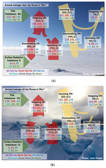 The Arctic radiative energy budget (CERES-EBAF) for (a) clear-sky and (b) all-sky conditions. Area averaged values over the domain presented in Figure 3 from 2002–2012 are given in black. Fluxes are further partitioned by surface cover as follows: all sea ice (purple), some sea ice (red), no sea ice (blue), all snow (teal), some snow (gray), no snow (green).