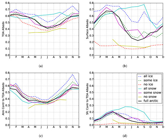 Annual cycles of (a) top of atmosphere (TOA) albedo, (b) surface albedo, (c) atmospheric contribution to TOA albedo, and (d) surface contribution to TOA albedo averaged over the Arctic (solid black) and surface partitions (colored lines) for 2002–2012 from CERES.