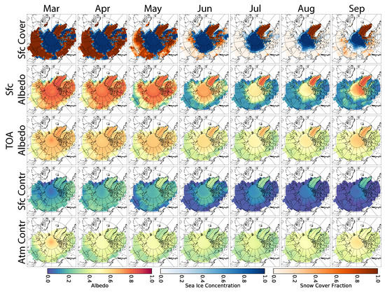 Average monthly maps of snow cover and sea ice fractions from NSIDC and albedos and TOA albedo contributions calculated from CERES all-sky fluxes. Months are averaged over 2002–2012. Only March through September are shown as they account for approximately 95% of annual solar insolation in the Arctic.