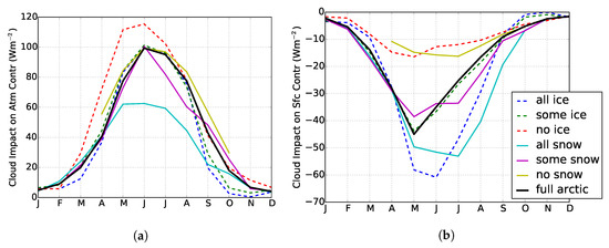 Cloud impacts on atmospheric and surface contributions to the TOA albedo are calculated using CERES all-sky and clear-sky fluxes. The clear-sky value is subtracted from the all-sky value and multiplied by the solar insolation at the TOA. These values correspond to SW radiation directly reflected by clouds (atmospheric contribution) (a) and the amount of SW that would have been reflected if clouds were not present (surface contribution) (b). Their annual cycles are plotted for Arctic-wide averages (solid black line) and various surface partitions (colored lines) for 2002–2012.