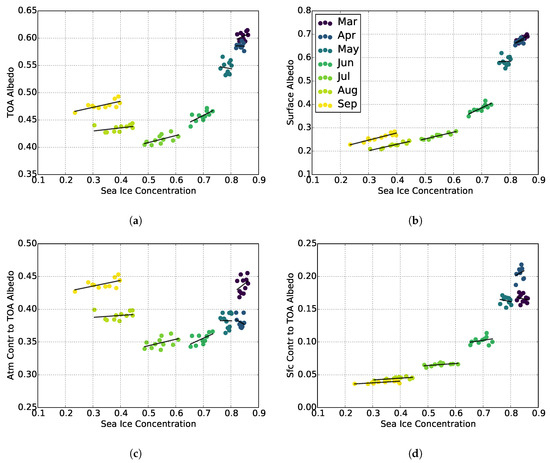 Arctic-wide averages of (a) top of atmosphere (TOA) albedo, (b) surface albedo, (c) atmospheric contribution to TOA albedo, and (d) surface contribution to TOA albedo plotted against the average sea ice concentration for individual months (March–September) during 2002–2012. Albedos and TOA albedo contributions are calculated from CERES all-sky fluxes. Lines of best fit are calculated using a linear least-squares regression, the slopes of which are given in Table 2.