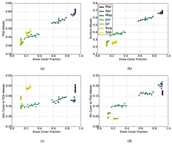 Same as Figure 8 but with snow cover fraction (SCF). Arctic-wide averages of (a) top of atmosphere (TOA) albedo, (b) surface albedo, (c) atmospheric contribution to TOA albedo, and (d) surface contribution to TOA albedo plotted against the average SCF for individual months (March–September) during 2002–2012. Albedos and TOA albedo contributions are calculated from CERES all-sky fluxes. Lines of best fit are calculated using a linear least-squares regression, the slopes of which are given in Table 3.