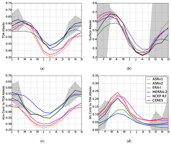 Figure 10c demonstrates that the discrepancies in TOA albedo largely result from differences in the atmospheric contribution. The annual cycles of biases between reanalyses and observations map closely onto those in TOA albedo. ASRv1, ASRv2, and NCEP R2 underestimate the atmospheric contribution to TOA albedo for all months, while MERRA-2 and ERA-Interim overestimate it for all but the winter months. This is not necessarily surprising since the atmospheric contribution is dominated by clouds, which is a common problem for reanalyses [32].