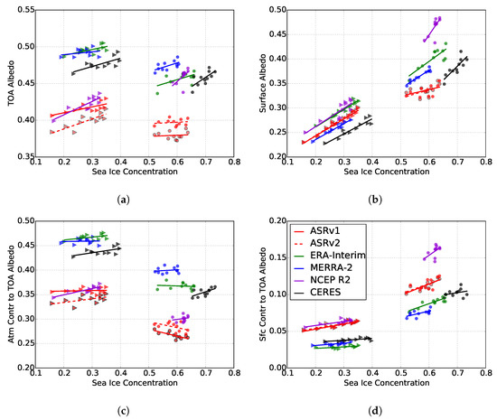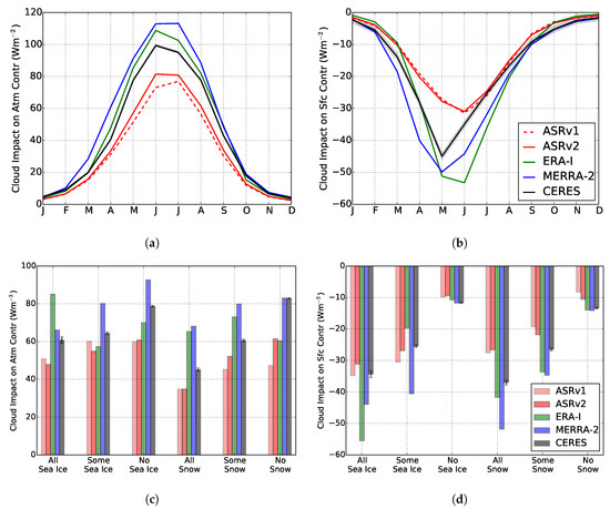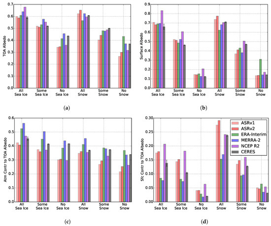 When partitioned by surface type (Figure 12c,d), the three reanalyses exhibit mixed behaviors. MERRA-2 and both versions of ASR capture the cloud effects on atmospheric and surface TOA albedo contributions. ERA-Interim shows the opposite trend—the cloud impact on the atmospheric contribution is larger over sea ice than open water and there is no clear dependency of it on snow cover. All three reanalyses show that the surface contribution cloud effect increases with surface brightness, although ERA-Interim overestimates the change between high and low albedo surfaces by nearly a factor of two over oceans (45 Wm versus 23 Wm from CERES).