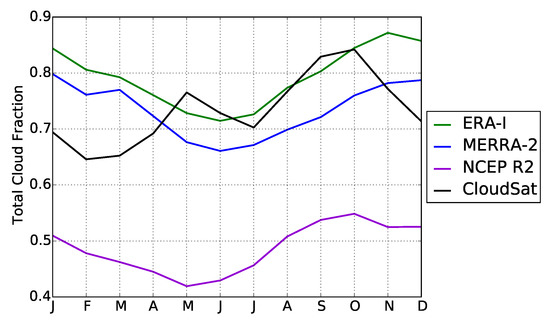 Some of the biases in reanalyses albedos can be attributed to their representations of clouds. Average cloud fraction over the Arctic up to 82° N is compared between CloudSat/CALIPSO and reanalyses, Figure 13. ERA-Interim matches observations fairly well May through October and overestimates the amount of clouds November through April. MERRA-2 is also near observations in summer and fall, although it underestimates cloud fraction during March-October and again overestimates cloud amount in winter. NCEP R2 underestimates cloud fraction for the entire year by 0.2–0.3. While none of these reanalyses directly assimilate cloud observations, the prognostic schemes used by ERA-Interim and MERRA-2 seem to perform better than the diagnostic cloud scheme from NCEP R2. The reader is directed to [34,35,69], for more detailed investigation of cloud representation in reanalyses.