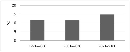 No significant difference in mean air temperature during MAM between the baseline period and the 2001–2030 period was found (Figure 1). On the contrary, in the 2071–2100 scenario, the mean air temperature was expected to increase by 22% relative to the baseline period.