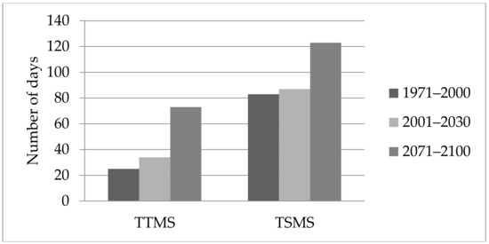 According to the future climate scenarios, the number of TTMSes and TSMSes were expected to increase significantly with respect to the baseline period. An increase in the total number of tropical and summer days in May was expected by 54% and 30% for 2001–2030 and 66% and 33% at the end of the 21st century, respectively, relative to the baseline period (1971–2000) (Figure 2).
