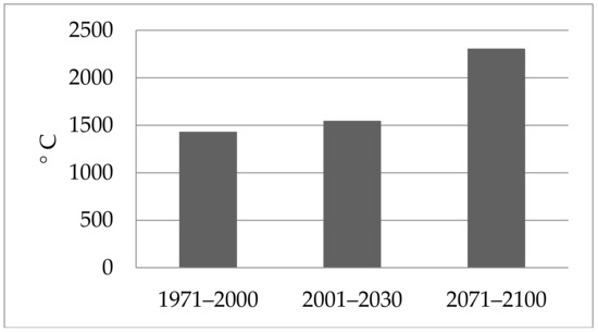 The sum of temperatures above 10 °C was likely to increase in the future over the baseline period (Figure 3). It is significant that, in the 2071–2100 scenario, the estimated increase over the baseline period was above 30%, whereas in 2001–2030 it was 8% relative to the baseline.