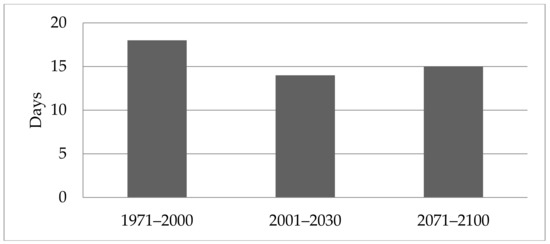 The duration of the flowering of spring barley over the baseline (1971–2000) and in the projected climate scenarios (2001–2030 and 2071–2100).