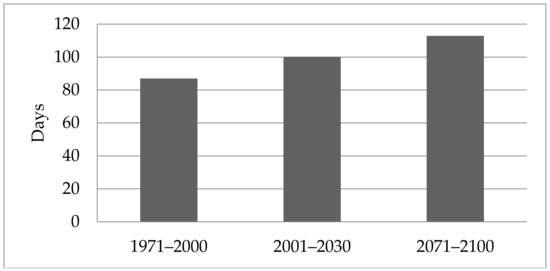 The results of the duration of spring barley’s growing season (from sowing to maturity) (Figure 5) indicated that, in the 2071–2100 scenario, barley was expected to prolong its vegetation by 13 days with respect to the 2001–2030 scenario and 25 days with respect to the baseline period.