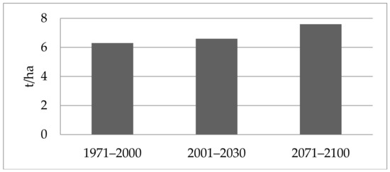 Our findings showed an increasing trend of average barley yield over the two climate projections (2001–2030 and 2071–2100) (Figure 6). Despite extreme events with respect to temperature changes during barley’s growing season in 2071–2100 (Figure 3), its mean grain yield was expected to be 13% higher than in the 2001–2030 period and 8% relative to the baseline period.