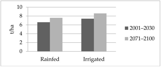 The results of the present simulation showed that net irrigation may have slightly improved the mean grain yield in the two projected scenarios (2001–2030 and 2071–2100) relative to rain-fed conditions (Figure 7). Irrigation with approximately 50 mm of supplemental water may have improved the grain yield by 0.7 t/ha in the 2001–2030 period, and a higher water supply (60–70 mm) was needed for an approximately 1 t/ha grain yield increase in the 2071–2100 period.