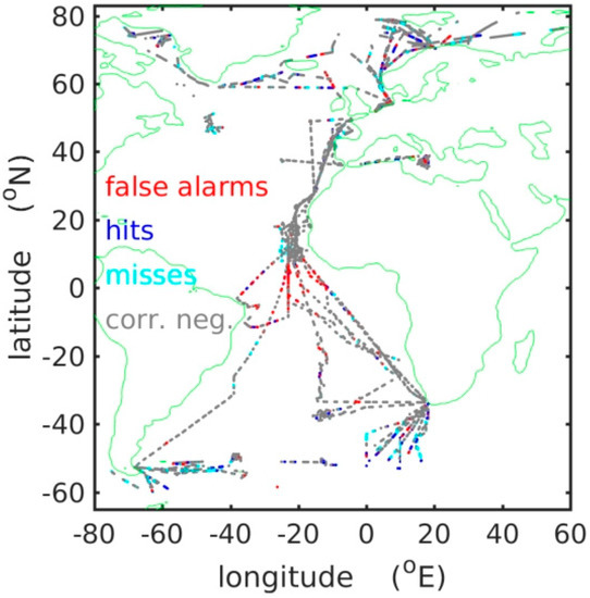 Locations of collocated data of ship measurements and HOAPS (Hamburg Ocean Atmosphere Parameters and Fluxes from Satellite Data) data merged to events. Colors indicate the results in terms of false alarms, hits, misses and correct negatives for each event used to build the 2 × 2 contingency table.