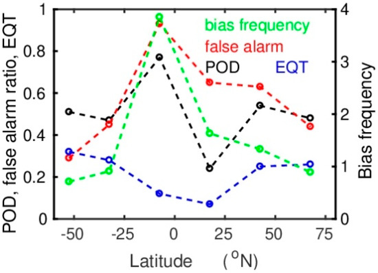 Figure 1 shows the locations of estimated hits, false alarms, misses, and correct negatives of the 2 × 2 contingency tables for each collocated event. As expected, because precipitation is a rare event, the correct negatives dominate. However, the pattern shows a concentration of false alarms especially in the vicinity of the intertropical convergence zone. This suggests that the performance of HOAPS to estimate precipitation depends on the latitude. Table 2 shows the results for six latitude belts. The coarse resolution of latitude belts is due to the limited number of collocated events. Table 2 gives the results for each ship and summarized for all ships, the latter is also seen for clarity in Figure 2. The bias frequency reached its highest values, exceeding 1, for latitudes between 20° S and 30° N, indicating that HOAPS indicates precipitation there more often than observations. Accordingly, the FAR and the POD reached high values, in which the FAR gave higher values than the POD. Combined with low values of the EQT this indicates a problem with HOAPS providing correct estimates of precipitation in the tropics. Differences between different ships were comparably small.