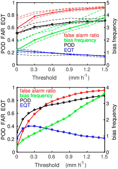 Similar to real data, with an increasing threshold applied on simulated observations, bias frequency increased rapidly as well as the FAR, while POD increased only slightly and the EQT dropped to values of less than 0.2 after a small increase to 0.38 for a threshold up to 0.3 mm·h−1.