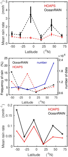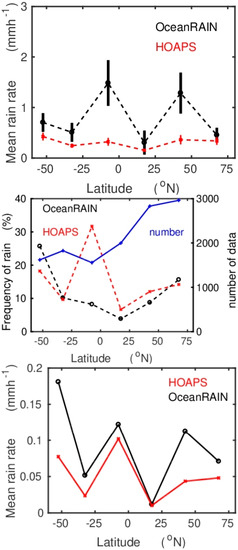 Summarized estimated numbers of binary statistics indicate a reasonable agreement between HOAPS and OceanRAIN, but there are some regional differences pointing to weaknesses in HOAPS’s performance to estimate precipitation correctly. To have a closer look at the data, the frequencies of precipitation (Figure 4 center), as well as the mean rain rates and their standard deviations for precipitating cases, were estimated for all latitude belts (Figure 4 top). Standard deviations are derived by applying the Bootstrap method [36]. The resulting average rain rates, calculated from the mean rain rate and the frequency of rain taking zero rain into account, are depicted in Figure 4 (bottom), too.