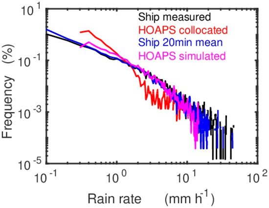 Thus, the method to improve collocations between point measurements and areal estimates by Reference [22] seems to be some kind of adjustment of the ship measurements, which are believed to be the truth, by the radar precipitation rate estimates. Another disadvantage of the method by Reference [22] is that observations of no precipitation, which may have failed to meet existing precipitation events within the HOAPS pixel due to the small probability of rain (Figure 6), cannot be adjusted by this method at all and are kept at zero precipitation.