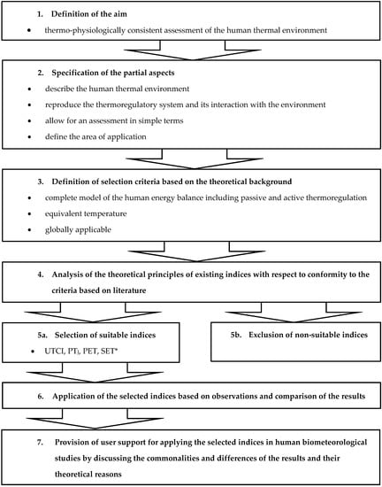 The methodical framework for the selection of thermal indices for applications in human biometeorological studies consists of seven steps (Figure 1).