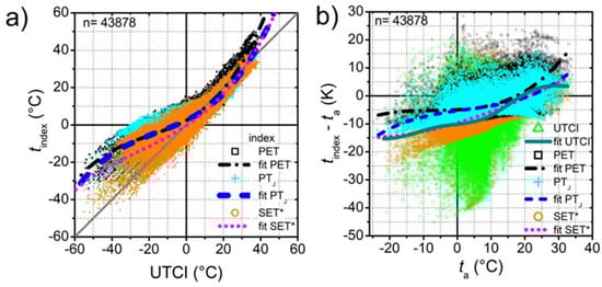 (a) PET, PTJ, SET* (tindex) dependent on UTCI; (b) UTCI, PET, PTJ, SET* (tindex) minus ambient temperature ta dependent on ta; Indices: each calculated based on identical environmental input from 5 European observational sites between 78.9° N and 30.9° N; tmrt derived using exclusively measured radiant components.