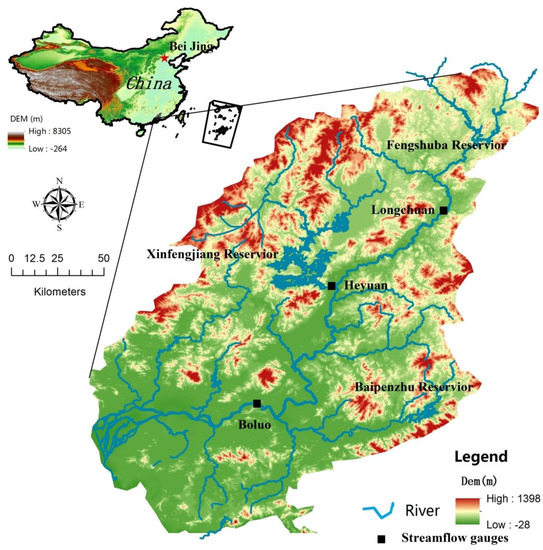 Under the influences of climate change and human activities, significant changes are occuring to the hydrological regimes of many rivers, and the occurrence frequency of extreme hydrological events has also significantly increased [1]. Schiermeier (2011) pointed out that the rainfall intensity in the northern hemisphere showed an increasing trend in the late 20th century, leading to an increase in flood risk [2]. Barnett et al. (2008) found that in the second half of the 20th century, significant changes had occurred to the water cycle in the western USA, 60% of which were caused by human-induced environmental changes [3]. In the context of global warming, the frequency and intensity of extreme weather events in the past 50 years showed a strengthening trend in China, mainly reflected by the extent and frequency of floods and other extreme events [4].