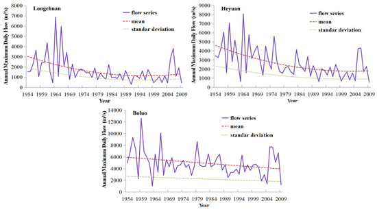 In order to ensure the independence of the hydrological sequence, “extreme” refers to the annual maximum daily flow in this study, and only one sample is taken in a year. Data series used for this study are the annual maximum daily flow of 1954–2009 at the Longchuan, Heyuan and Boluo Stations. Due to the limited length of the data series, only the trends of first two moments were considered in this study with respect to the following situations: