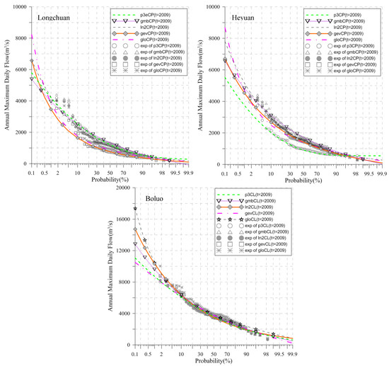 AIC was taken as the discrimination criterion of the optimal model (Table 5). Table 6 shows the parameter estimations for all distributions by MLE. It is seen from Table 5 that the LN2CP model at Longchuan, GMBCP model at Heyuan, and GMBCL model at Boluo Station were the best fitting models in terms of the AIC values. The performance of the optimal model selection using AIC can be analyzed from two aspects, i.e., from the characteristic of distribution curves and from the trend model, as detailed in the following sub-sections.